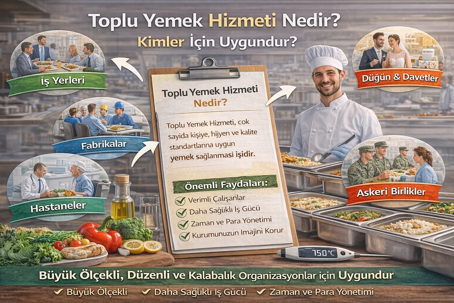 “Toplu yemek hizmeti nedir? Kimler için uygundur? Kurumsal işletmeler, fabrikalar ve şantiyeler için toplu yemek çözümlerinin avantajları.”